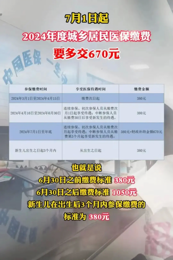 从2024年6月30日前,大家只需缴纳个人缴费标准部分,即每人380元,就可以享受当年的财政补贴670元。而每年的7月1日至12月31日参保缴费的(除出生三个月内的新生儿),个人则需一次性缴纳当年财政补助标准670元和个人缴费标准的费用,合计每人1050元。