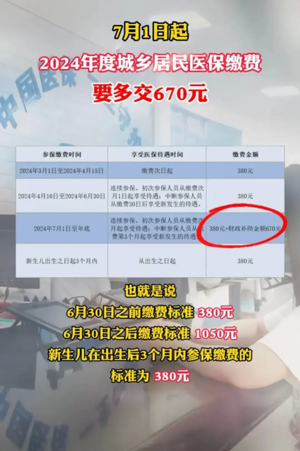 这意味着,如果你在6月30日前参保缴费,只需要支付380元,就可以享受到670元的财政补贴;而如果你在7月1日之后才去参保缴费,那就得一次性掏出1050元了。这中间的差价,可是整整670元啊!