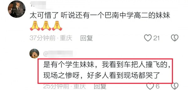 太可惜了,受伤的人中还有一个巴南中学高二的妹妹,车辆直接给撞翻了。