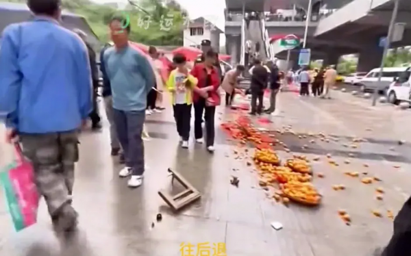 现场小摊贩的橘子被撞的散落一地,到处都是。物品被撞到就算了,还有那么多的人也被撞到了,这是最悲惨的。