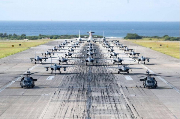 驻日美军嘉手纳的美空军航空联队机群"大象漫步"全家福,包含:F-22、F-15、E-3和MH-60等