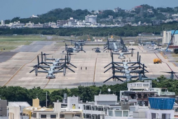 驻日美军普天间基地停放的MV-22倾转旋翼机群