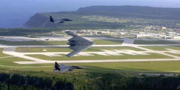 关岛安德森空军基地上空飞行的美军B-2战略轰炸机和F-15战斗机