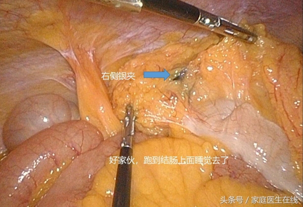 腹腔镜视野在迷宫般的人体里缓缓推进,不放过一寸蛛丝马迹,终于,当李英儒轻柔地掀开结肠前方的大网膜,"逃逸"的小夹子再也藏不住了,只能乖乖地停在大网膜上,被李医生一举"抓获"!
