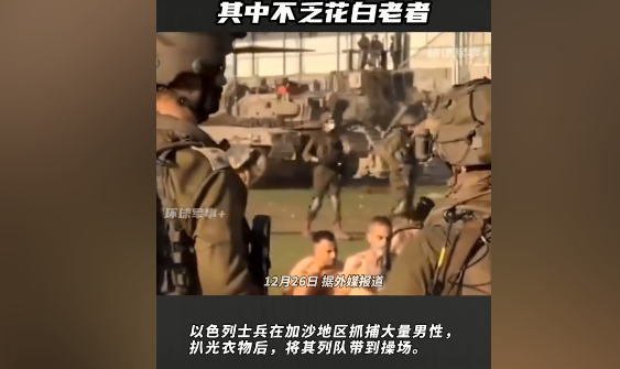 12月26日,据外媒报道,以色列土兵在加沙地区抓捕大量男性,扒光衣物后,将其列队带到操场。