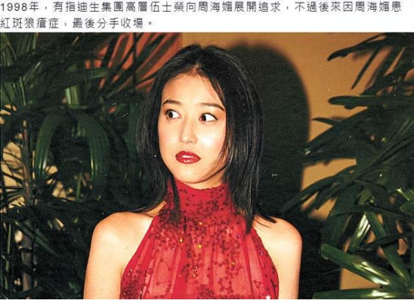 但要说对周海媚伤害最大的,应该还是与富商伍士荣的一段情,在与伍士荣交往期间,她患上了红斑狼疮,这是一种慢性、反复发作的自身免疫性疾病,虽然病情可以通过治疗控制,但随时可能复发,有传闻称,富商正是因为周海媚生病选择了分手,但是多年后,周海媚又否认自己患病。