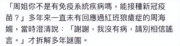 也许正是因为病痛和过往感情经历,周海媚不再执着婚姻与家庭,曾经亲口说过不想生小孩。。
