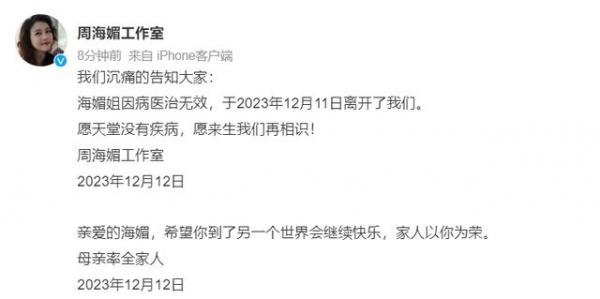 2023年12月12日,周海媚工作室终于出面回应了周海媚去世传闻,确认了57岁的周海媚因病去世了。