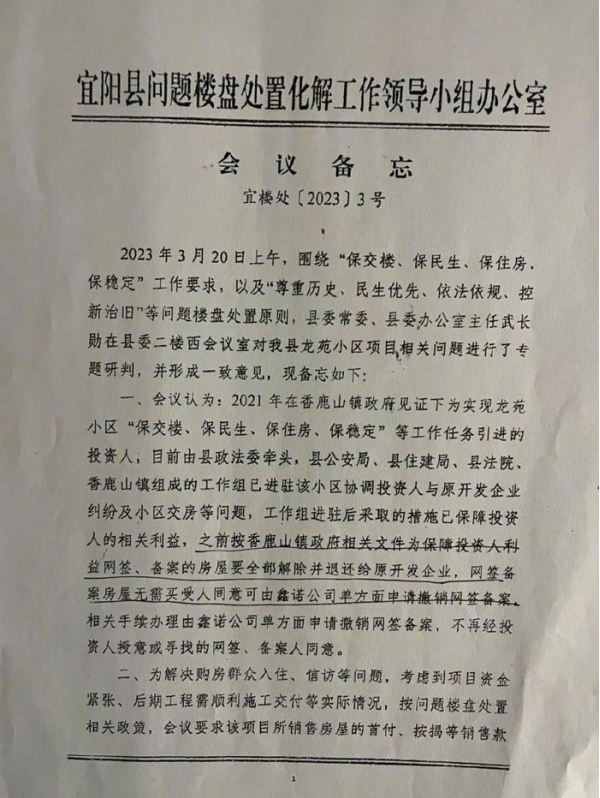 宜阳县问题楼盘处置化解工作领导小组办公室会议备忘录