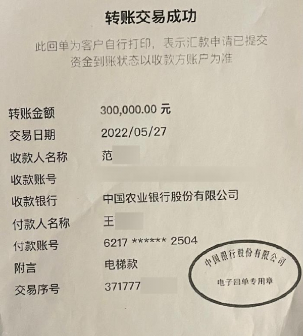 王小文一方付了30万元给电梯公司