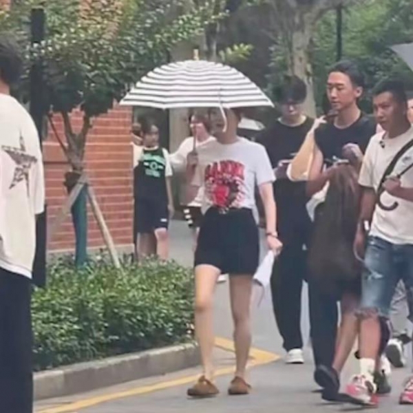 孙俪此番亮相,发型也别具一格,她扎起丸子头,配以整齐的刘海,脚踏勃肯鞋,手持条纹遮阳伞,步履间尽显优雅与随性。而那黑色短裤下展露的一双笔直且雪白的美腿,更是吸引了无数目光,成为校园内一道亮丽的风景线。