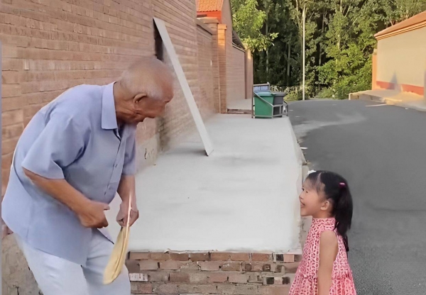 这时,一个小女孩急急地跑了出来,孩子大约3岁左右,扎着两根小辫子,穿着粉色碎花的小裙子,可爱极了,她边跑边大声喊着:"太爷爷,太爷爷!"