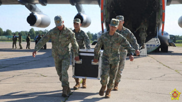 白俄罗斯国防部公布的这张照片显示中国军队抵达白俄罗斯。