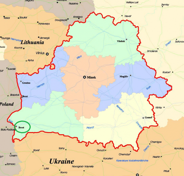 布列斯特距波兰边境不到 5 公里,距乌克兰本土约50公里。(下边示意图中绿色圈中城市)