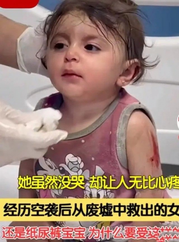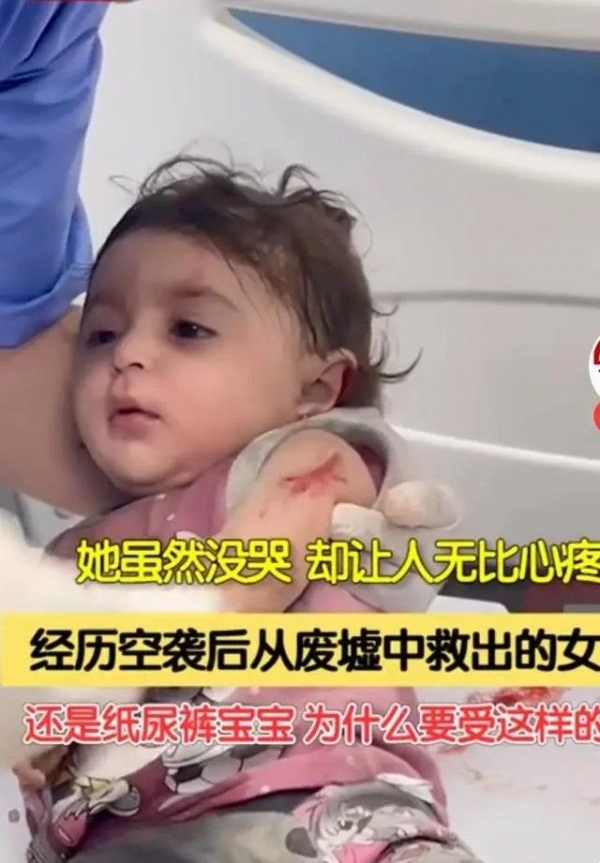 这个是从加沙空袭后的废墟中扒出来的小女孩,年龄估计就在一岁左右,她在废墟中被压了一天,小女孩手上还受了伤,尿不湿都装满了尿!