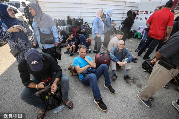 当地时间2023年10月14日,巴勒斯坦加沙地带,持外国护照的加沙人等待抵达拉法边境大门,等待进入埃及。
