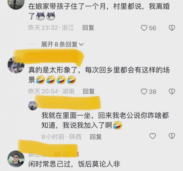 甚至有网友现身说法,她们真的好可怕,我带着孩子回村里住了一个月,人家说我老公跟别的女人跑了,真是哭笑不得。后来婆婆问她们,从哪里得知的消息,人家竟然说猜测。真服了那帮老太太了。