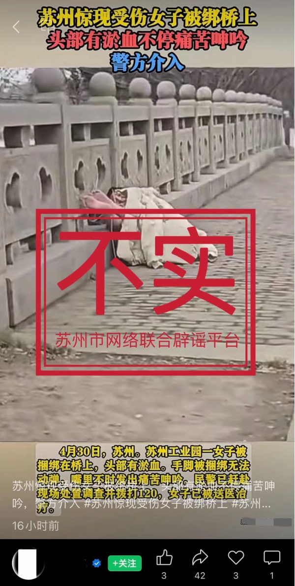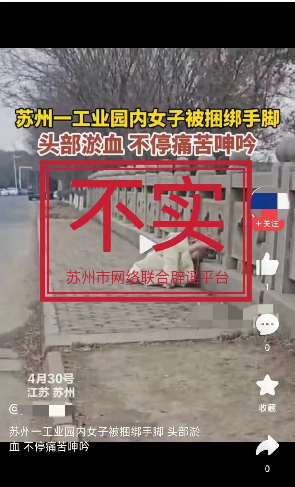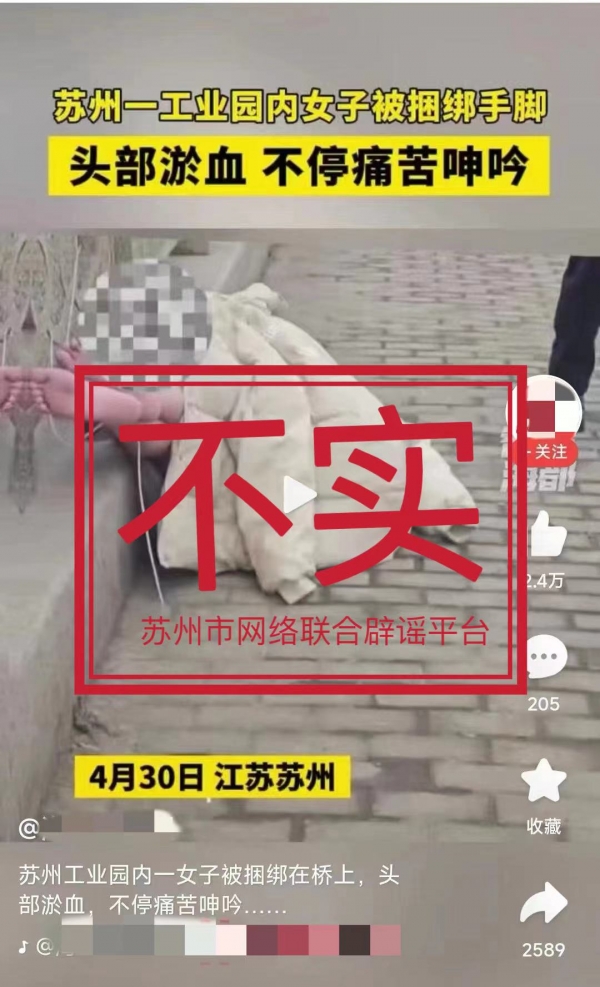 一女子身体裸露被捆绑手脚,不停痛苦呻吟? 2024-05-01 14:20 今日头条 近日,有网民和媒体发布视频和图文称4月30日"苏州一工业园内一女子被捆绑手脚,头部淤血,不停痛苦呻吟……",经向有关方面了解,网传内容系翻炒旧闻,为不实信息。请广大网民不信谣、不传谣!