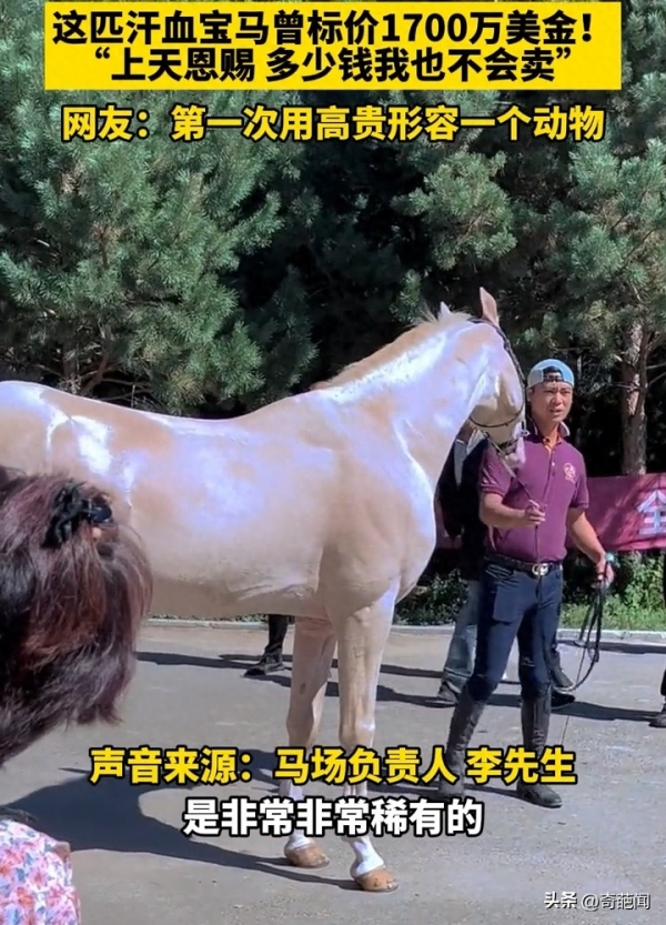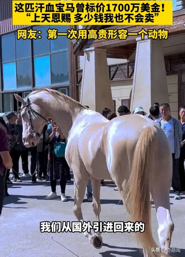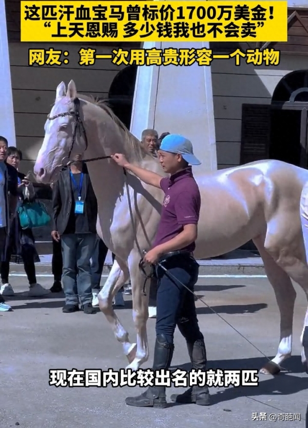 据悉目前国内仅有两匹这样的稀有宝马,可谓是珍稀物种,此前曾有外国买家出价高达1700万美元购买这匹汗血宝马,然而马主却坚决拒绝了这个天文数字的报价,马主人表示:""这是上天给予我的恩赐,无论对我来说有多少钱都无法取代"。