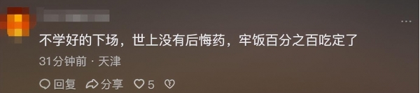 网友表示这就是不学好的下场,世界上没有后悔药,本来前途无聊,都已经走到了这个高度了,为什么还不满足,要搞这些花花肠子,最终落得这样下场是注定的!