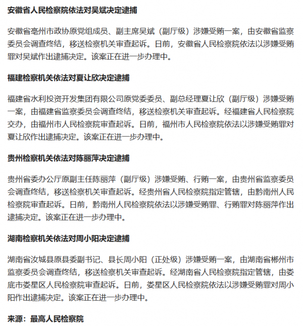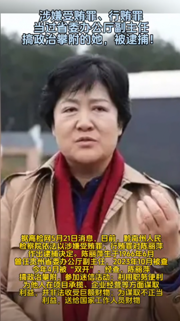 据正义网报道,5月21日最高人民检察院宣布,贵州省委办公厅原副主任陈丽萍(副厅级)涉嫌受贿、行贿一案,由贵州省监察委员会调查终结,移送检察机关审查起诉。经贵州省人民检察院指定管辖,由黔南州人民检察院审查起诉。日前,黔南州人民检察院依法以涉嫌受贿罪、行贿罪对陈丽萍作出逮捕决定。该案正在进一步办理中。