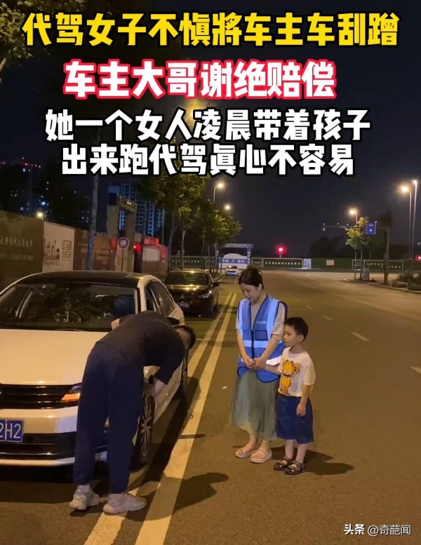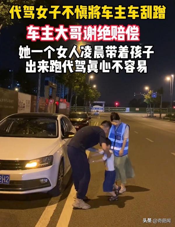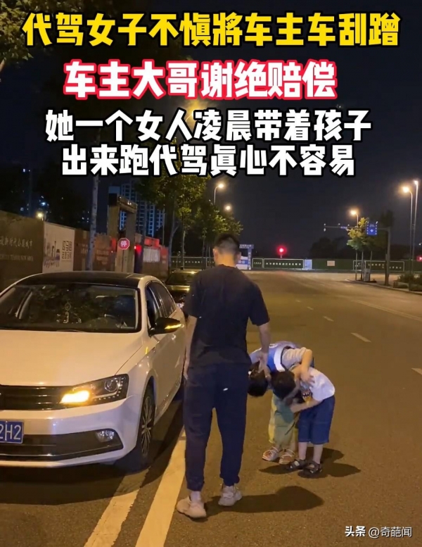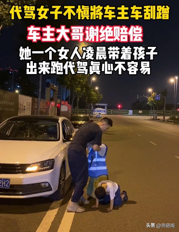 因为她知道造成的赔偿将是她这一个月白干了,见到车主也从车内下来,女子十分愧疚带着娃下跪祈求原谅,好心的车主深感对方的不易,也没有要求赔偿,而是连忙将母子俩扶起来,这一幕不少网友看后议论纷纷。