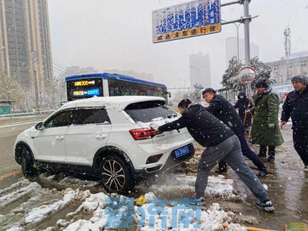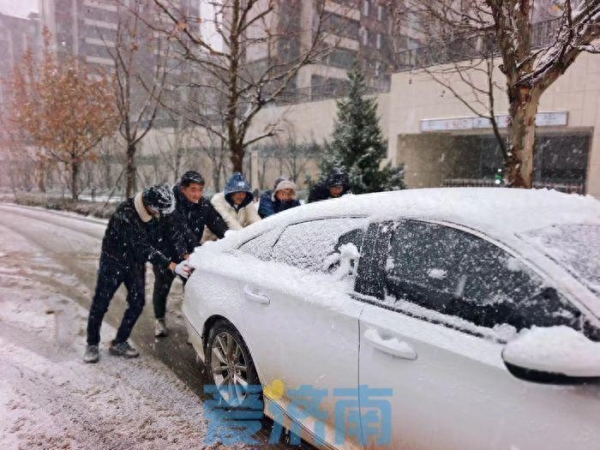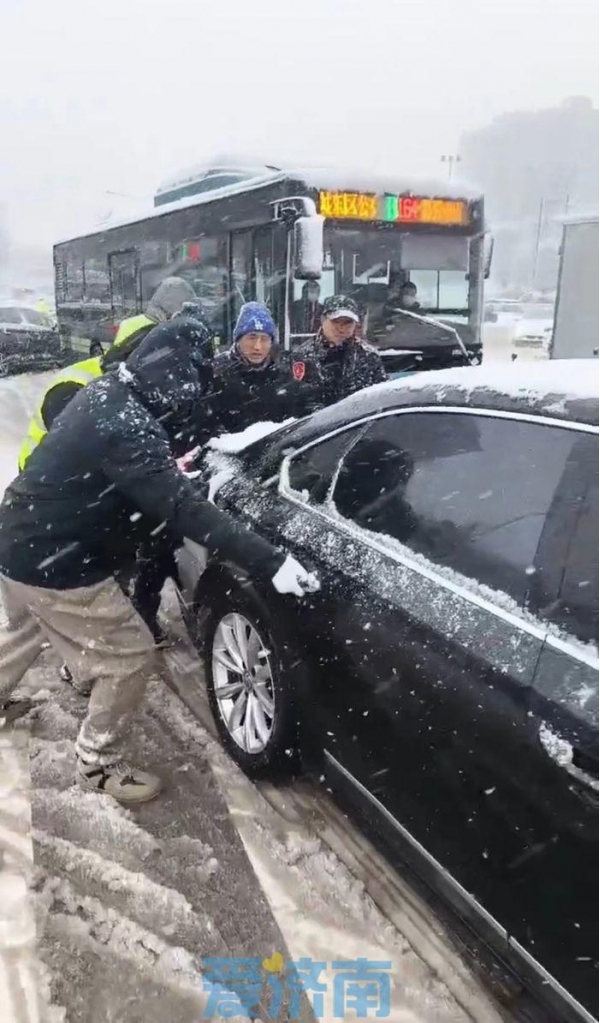 12月14日下午,大雪如约而至,多辆私家车打滑"趴窝",济南公交工作人员化身"推车侠",帮助多辆私家车脱困。