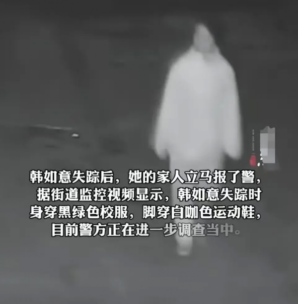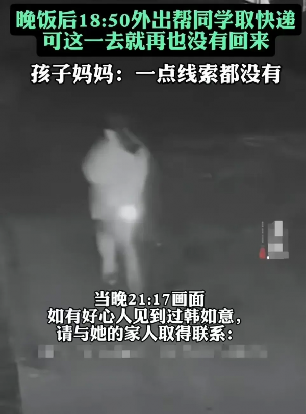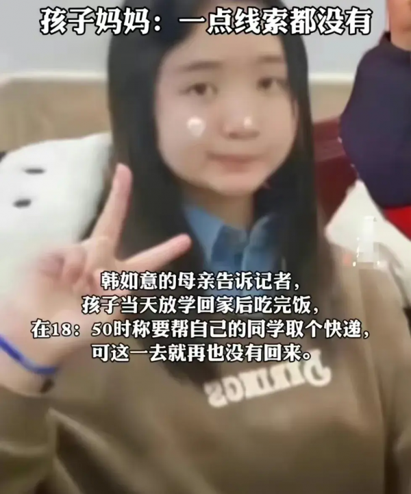 韩如意失踪要追溯到3月25日,据韩如意的母亲讲述,当天傍晚6点50分左右女孩说要去帮同学拿快递,之后便彻底失去音讯。