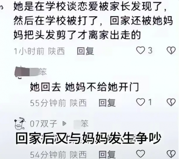 此后又有网友透露,韩如意在失踪前在学校谈恋爱被家长发现了,先是在学校被打,回家后与妈妈发生激烈争吵后又被剪去了头发,之后便离家出走。