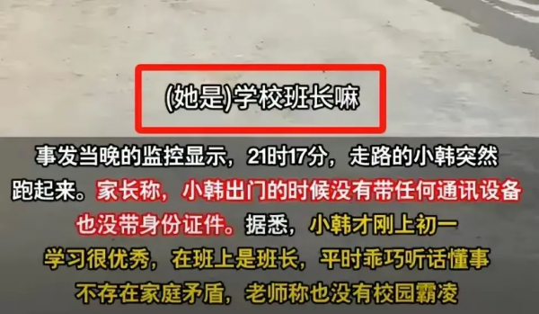 不过该说法很快便被韩如意的老师否认了,该老师称小韩才刚上初一,学习成绩很优秀,是班里的班长,小韩平时很乖巧也很懂事,没听说过有什么家庭矛盾,更不存在在学校被人欺负一说。