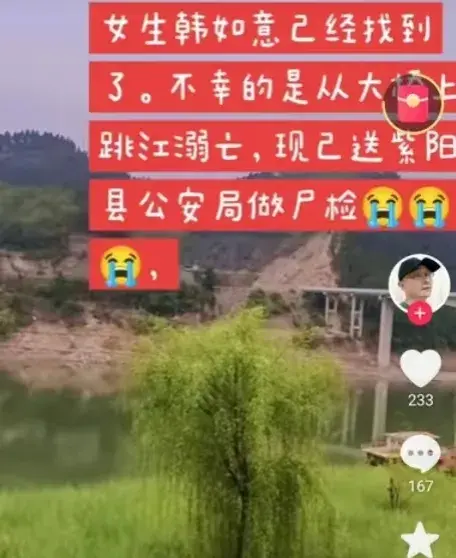 4月5日,陕西安康紫阳县汉王镇13岁女孩韩如意,在失踪了十几天后,其遗体在河中被发现。