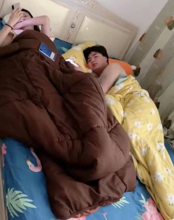 只见闺蜜和弟弟,都躺在她的大床上,弟弟盖了一床黄色碎花的被子,闺蜜盖了一桩深棕色的被子,闺蜜手里拿着手机,正在津津有味地看着短视频,而弟弟则静静地躺在旁边,眼睛盯着闺蜜看。