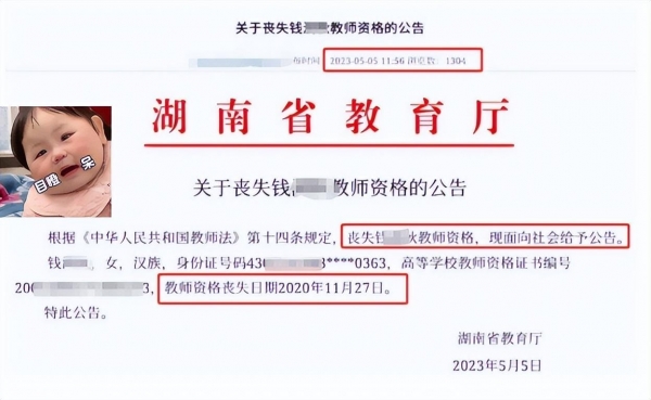 就在大家纷纷支持两位教授的关键时候,突然又迎来了"反转"。教授的真实身份被扒出来了,原来网红教授钱一原名钱满秋,早在2020年11月被相关部门取消了教师资格证书。