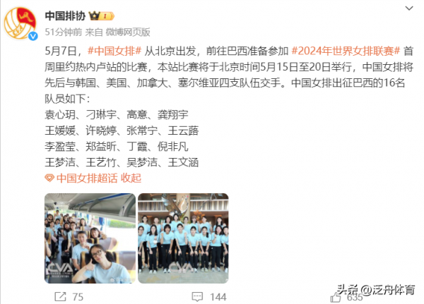 5月7日,中国女排从北京出发,前往巴西准备参加 2024年世界女排联赛首周里约热内卢站的比赛,本站比赛将于北京时间5月15日至20日举行,中国女排将先后与韩国、美国、加拿大、塞尔维亚四支队伍交手。中国女排出征巴西的16名队员如下: