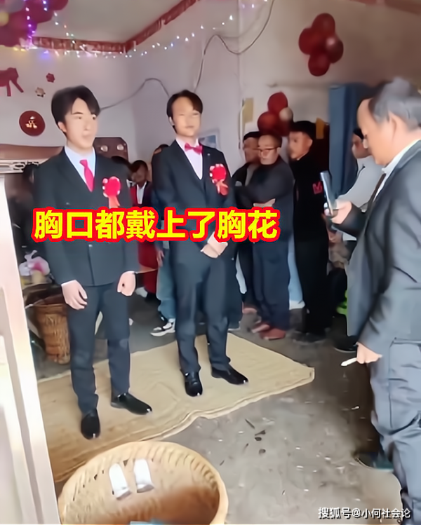 在农村一婚礼上,两名年轻男子穿着西装在亲朋好友的见证下一起走进了大堂,他们一个打领结,一个打领带,胸口上都佩戴着新人才有的胸针,看起来十分帅气。
