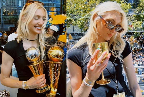 这次勇士队的夺冠游行,很多球员家属都登上了游行车,包括妻子、女友、孩子,值得一提的是,总决赛MVP库里还把同为篮球运动员的妹妹卡梅隆-布林克带上了,这位超级大美女身材一流,颜值顶级,而且还会打篮球,简直是完美人设,在游行车上,她也与库里、阿耶莎亲密合影,非常开心。