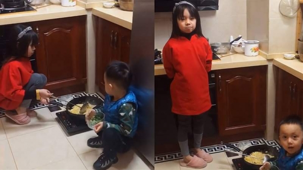 近日,贵州。一位单亲父亲晚上加班,早上起晚了,进厨房看到女儿带着弟弟蹲着做饭。