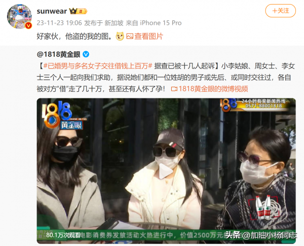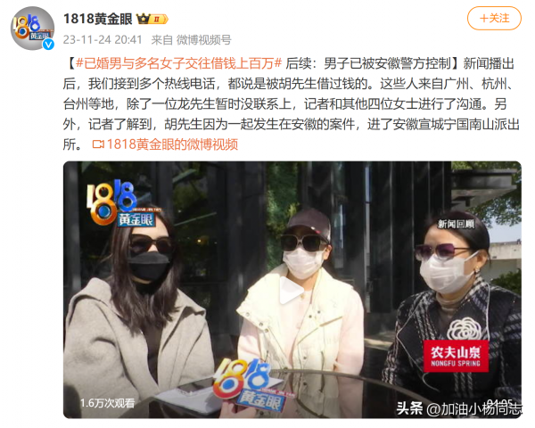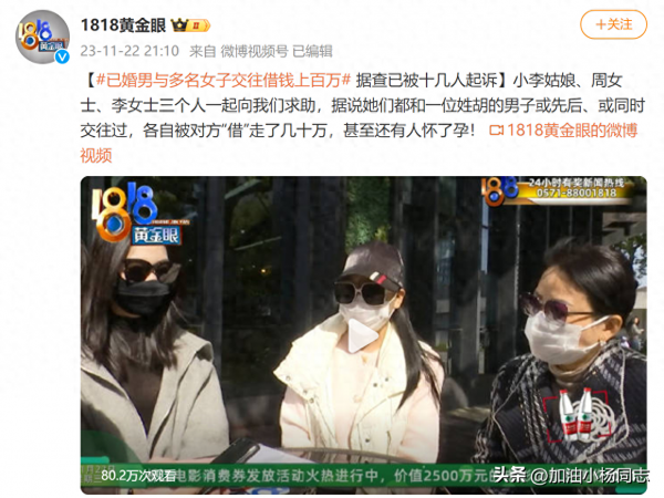 近期,浙江电视台6频道《1818黄金眼》栏目组官方微博发布一起事件采访调查:小李、周女士、李女士三个人一起向节目组求助,称她们都和一位胡姓男子或先后、或同时交往过,均被对方以恋爱、结婚的名义"借"走了几十万后消失,有人为其怀孕,有人为其倾家荡产。