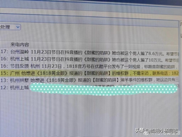 该事件经《1818黄金眼》栏目组播出后,栏目组接到了来自广州、杭州、台州等地十几位女士来电,都表示自己和胡某有大额经济纠纷,都想要加入"甜蜜的陷阱"维权群。