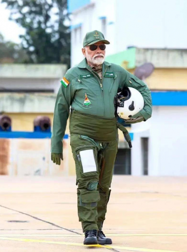 根据印度官方发布的视频,莫迪造型"亮眼":视频中莫迪一身飞行员装束,戴着飞行员墨镜和飞行员头盔,坐进了双座型"光辉"战机的驾驶舱。战斗机滑跑时,后座的莫迪笑容绽放,频频冲伴飞拍摄的战斗机挥手、竖大拇指。