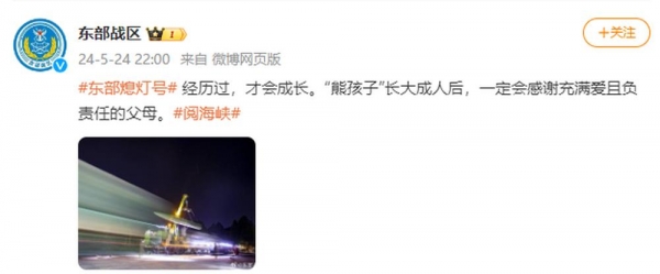 5月24日晚,@东部战区 发文:经历过,才会成长。"熊孩子"长大成人后,一定会感谢充满爱且负责任的父母。