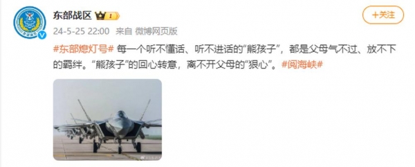 5月25日晚,@东部战区 发文:每一个听不懂话、听不进话的"熊孩子",都是父母气不过、放不下的羁绊。"熊孩子"的回心转意,离不开父母的"狠心"。