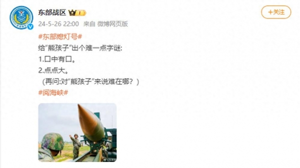 5月26日晚,@东部战区发文称, 给"熊孩子"出个难一点字谜:
