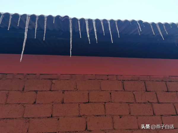 东北的冬天雪冻了又化、化了又冻…所以低矮的房檐上总有许多冰溜子。晶莹剔透的冰溜子像房屋的头发帘、也像一把把魔仙棒。