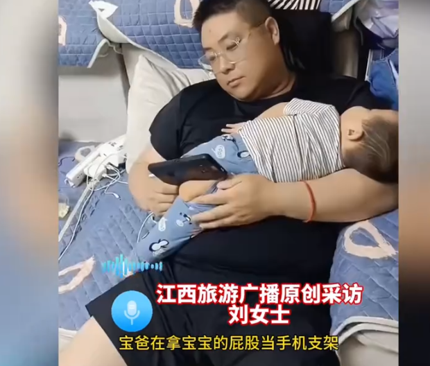 宝妈记录老公带娃的一幕,用宝宝屁股当手机支架,好小众的手机支架。宝妈刘女士:当时,我在收拾屋子,宝爸在哄孩子睡觉,然后一抬头,宝贝睡着了,宝爸在拿宝宝的屁股当手机支架看《庆余年2》,当时也没多想,就感觉挺有意思的,就拍个视频记录一下。