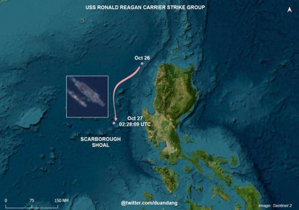 其实我们仔细观察近日黄岩岛附近海域的海空动态不难发现,菲律宾海军此次敢直接下场的直接原因是美国海军"里根"号航母打击群的撑腰。根据开源信息显示,"里根"号航母打击群在10月26日左右再次进入南海,并于27日抵达距离黄岩岛不足40海里的海域。在抵近黄岩岛之后,"里根"号航母就进行了高强度的舰载机载弹起降作业,F/A-18E/F"超级大黄蜂"舰载战斗机以及E-2D舰载预警机接连升空,这种军事训练的目的只有一个,这就是美军想要在黄岩岛附近海域跟假想敌进行一场高强度海空冲突,而这个假想敌正是中国。