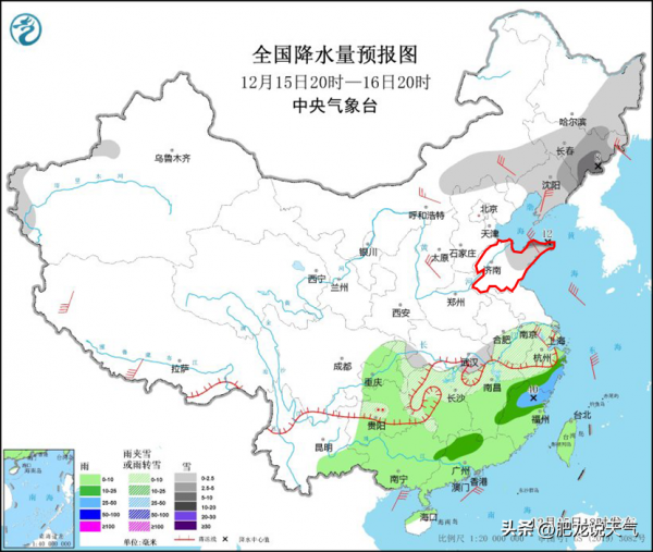 根据中央气象台发布的全国降水量预报图,12月15日20时至16日20时,山东半岛北部,包括烟台、威海等地局地有大到暴雪(10~12毫米)