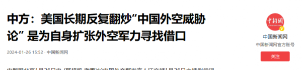 美国方面一直炒作所谓的"中国太空威胁论",无非是想遏制中国航天事业的发展,维护其在太空领域的垄断地位。