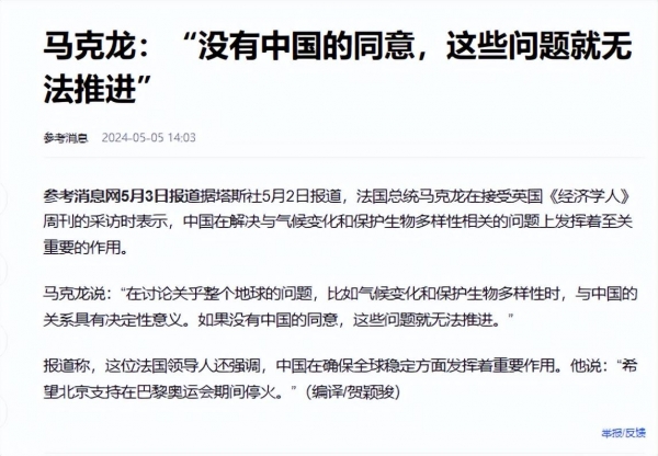 马克龙在多个场合坦言,中国在应对气候变化等全球性挑战方面发挥着决定性作用,承认中国在确保全球稳定中的重要地位。