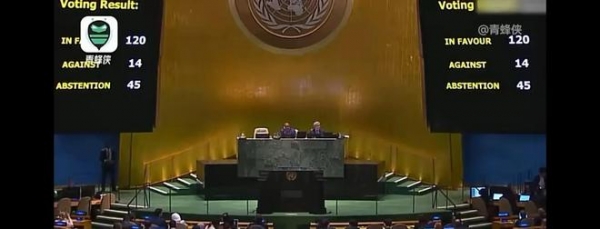 投反对票的14个国家包括美国、以色列、奥地利、克罗地亚、捷克、斐济、危地马拉、匈牙利、马绍尔群岛、密克罗尼西亚、瑙鲁、巴布亚新几内亚、巴拉圭和汤加。令人瞩目的是,这其中唯一一个大国就是美国,就连美国的盟友英国也没有跟随其反对这一决议。